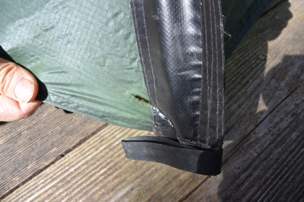 使用感はそれほどありませんが、1点、破れあり、写真2枚目を参照してください。ペグもあります。