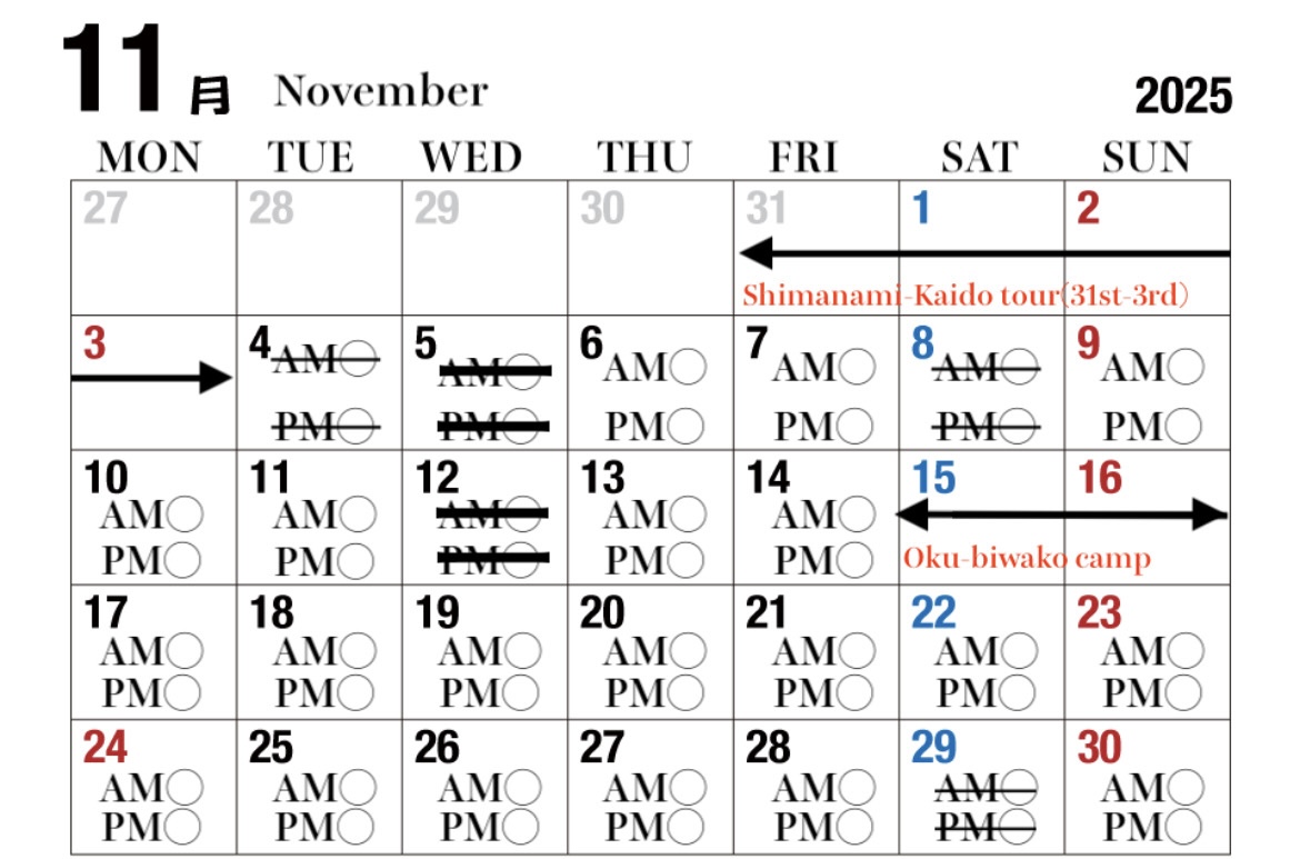 上記、日程については、ご予約の更新が追いつかない場合があります。Eメール、お電話でお申し込み頂いた時点で、ご予約確定のお返事をさせて頂きます。