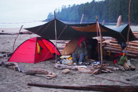 テントを張り、タープで強い日差しや、雨、夜露、風を避け、火を使い、暖をとり、調理すること、