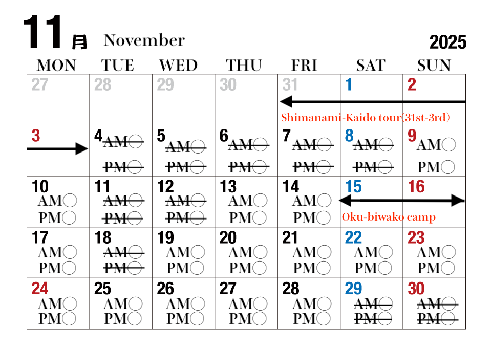 ■Availability:check the calendar below. Pick either AM(9:00-12:00) or PM(13:00-16:00). If both the AM and PM are available, you can also offer a one day tour.